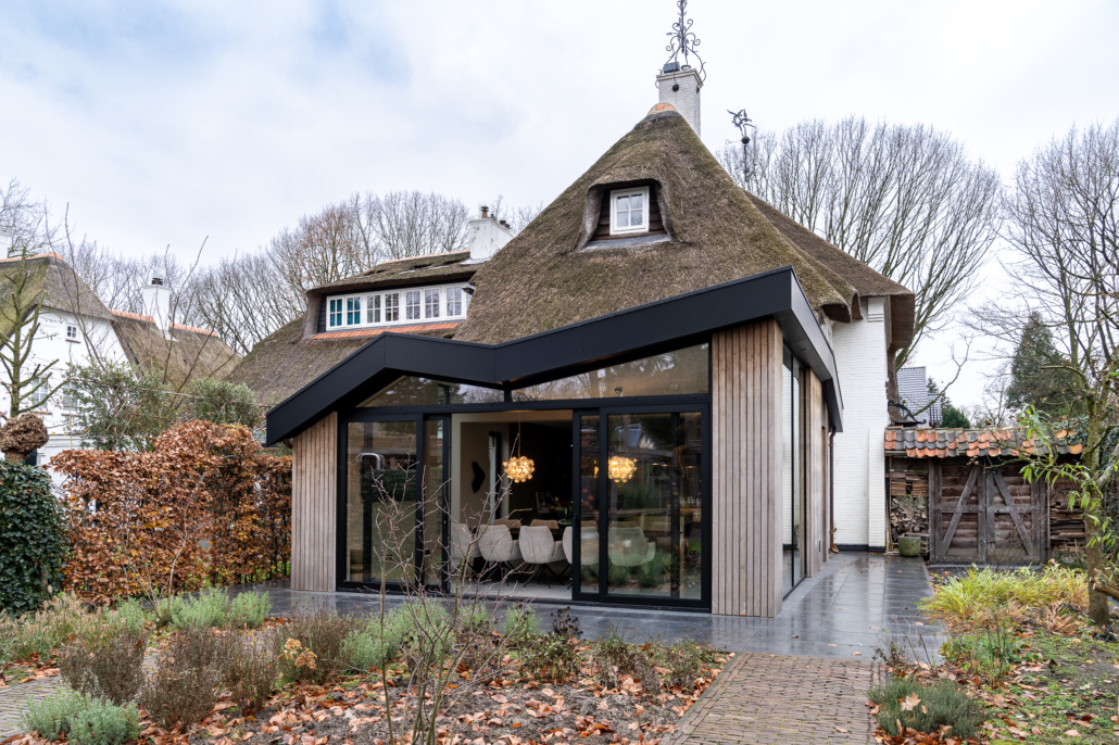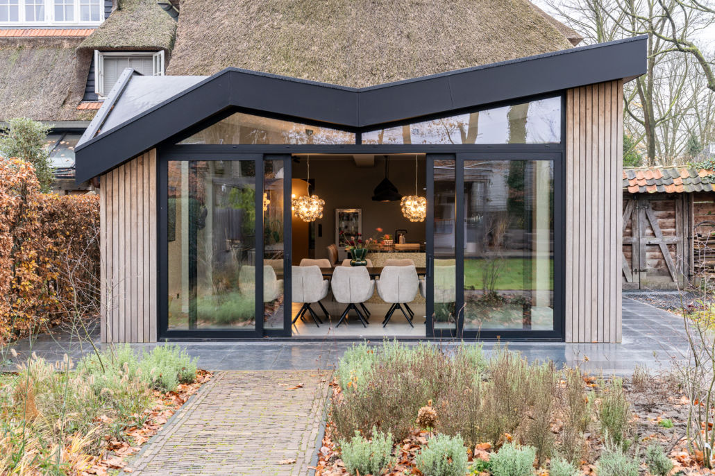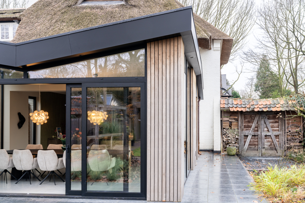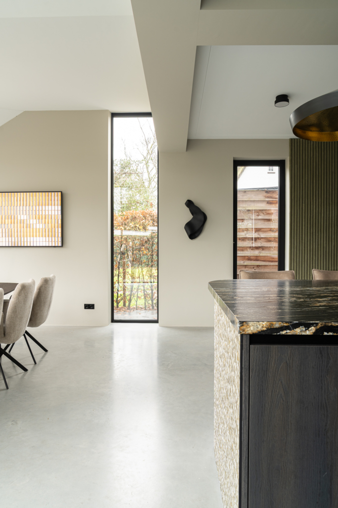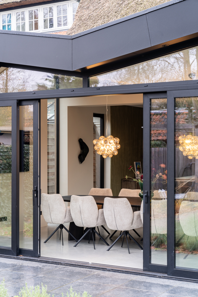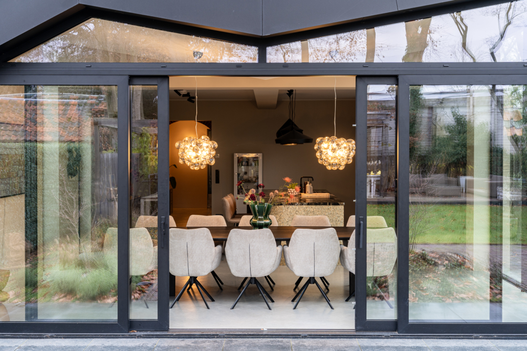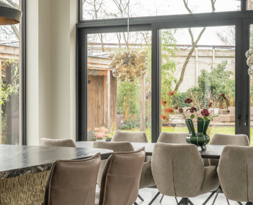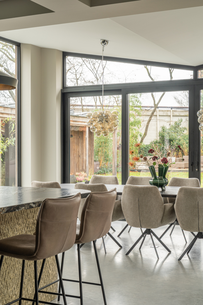 De aanbouw van de keuken zorgt voor een prachtig lijnenspel en uitzicht op de tuin. De open keuken met een ruime eettafel zorgt voor sfeer en gezelligheid. Een plek waar je uren kan borrelen.