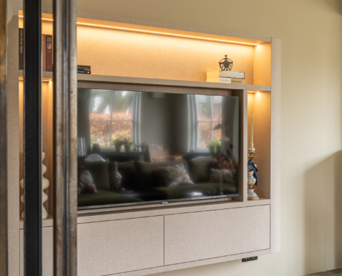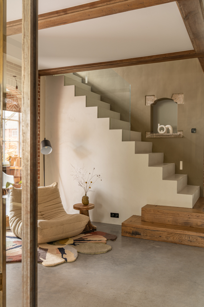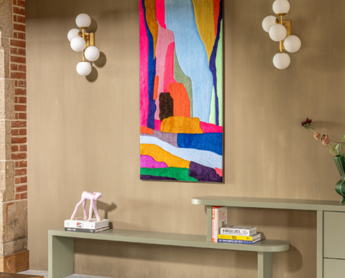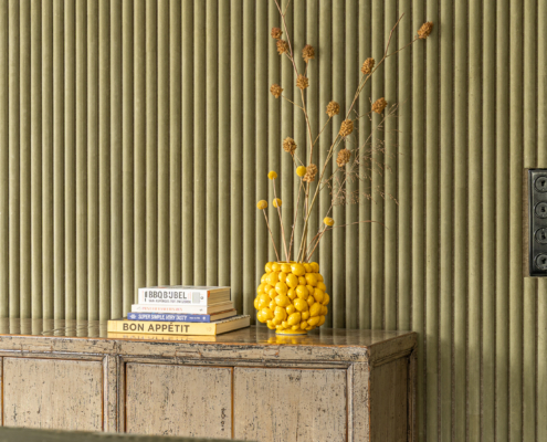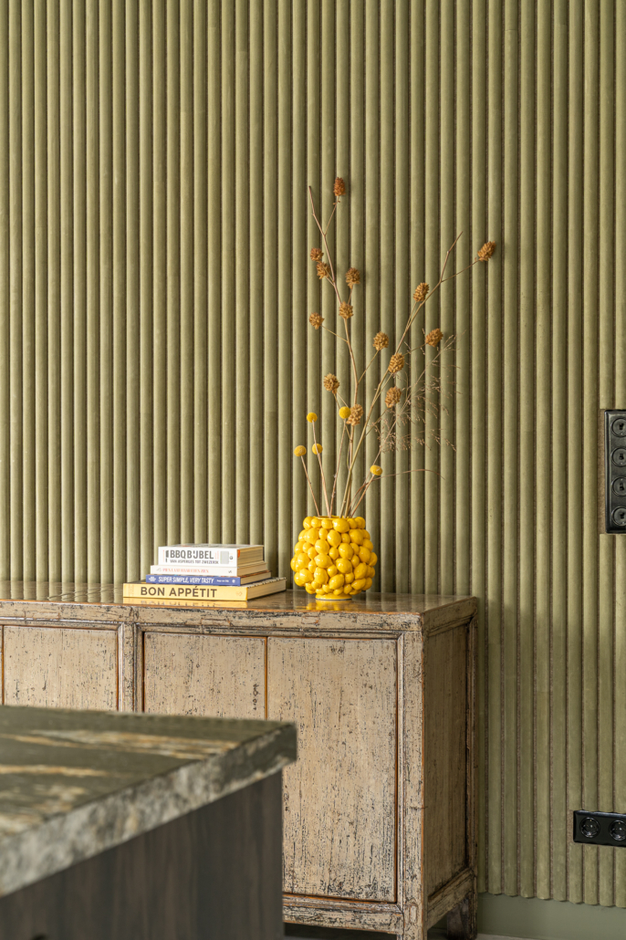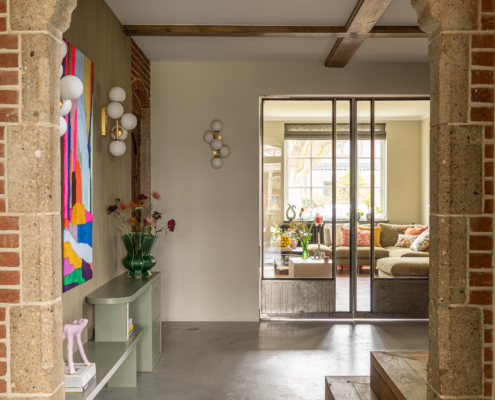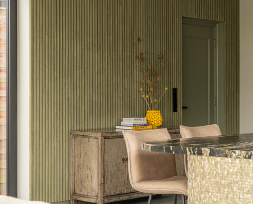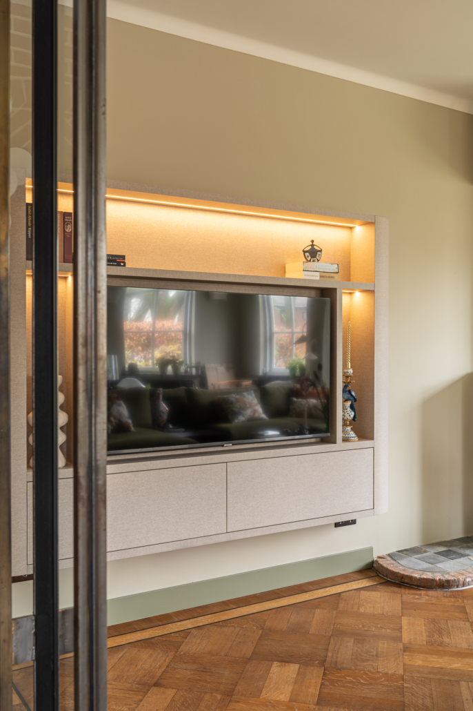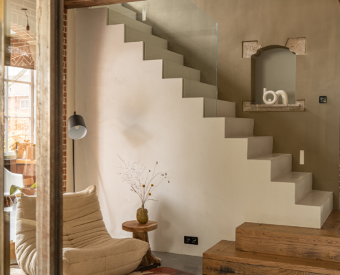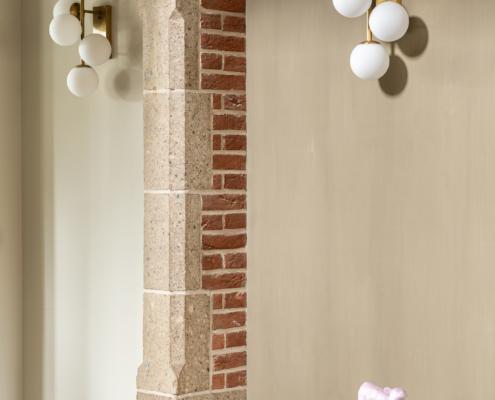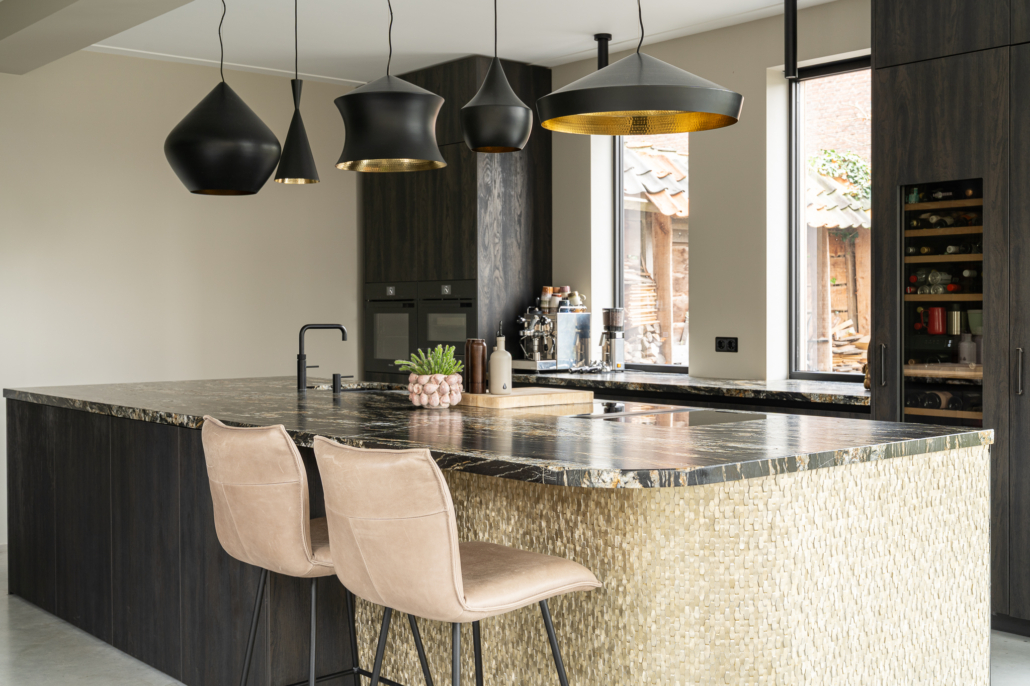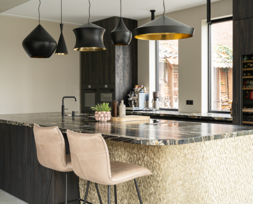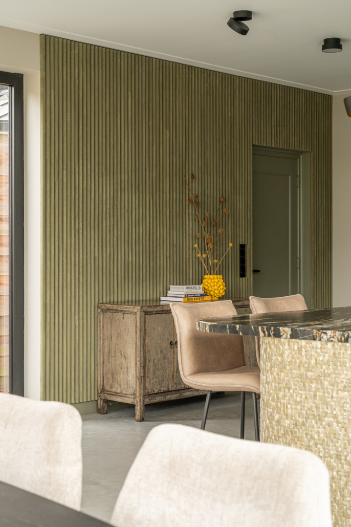 In het interieur is een combinatie gemaakt van prachtige bestaande details met nieuwe meubels. Hierbij hebben wij gebruik gemaakt van maatwerkmeubels, dit zodat je ruimte het beste tot zijn recht komt! In de hal hangt een prachtig kunstwerk van STEIL Studio. Deze zorgt voor een echte eye-catcher wanneer je binnenkomt maar ook gelijk voor een stukje akoestiek.