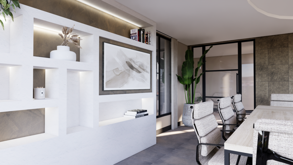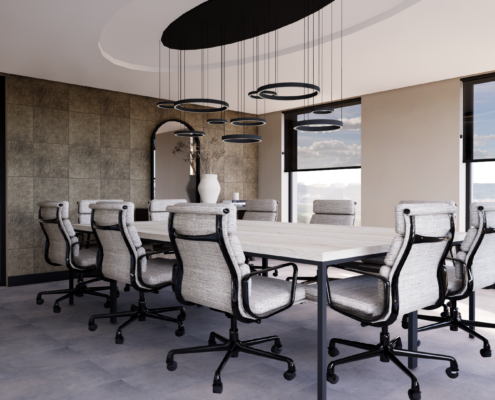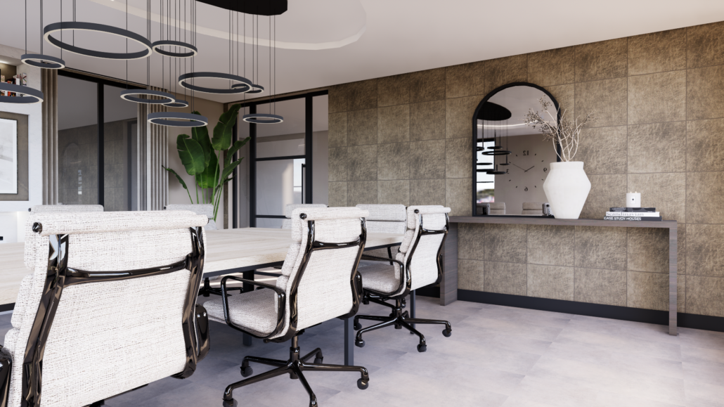 Dit bedrijf wilde hun vergaderruimtes een nieuwe uitstraling geven met een ontwerp waarin hun eigen werk en technieken zichtbaar zijn. Zo worden de ruimtes niet alleen gebruikt om te vergaderen, maar vormen ze ook een beleving voor de klant: een soort showroom voor hun eigen diensten.