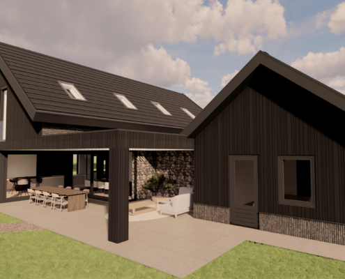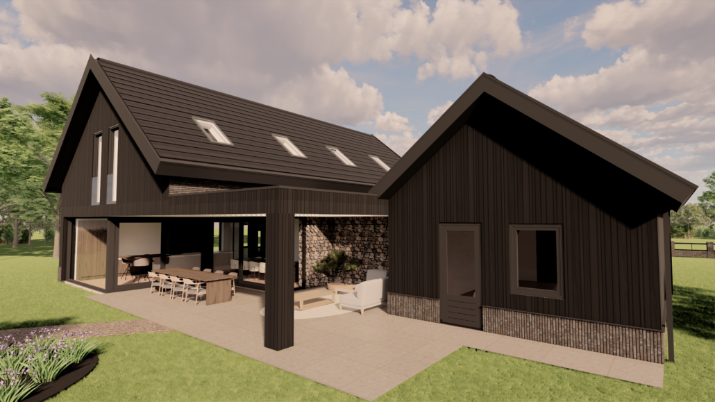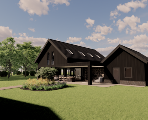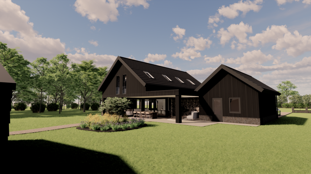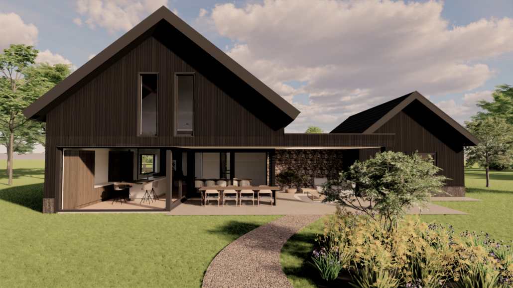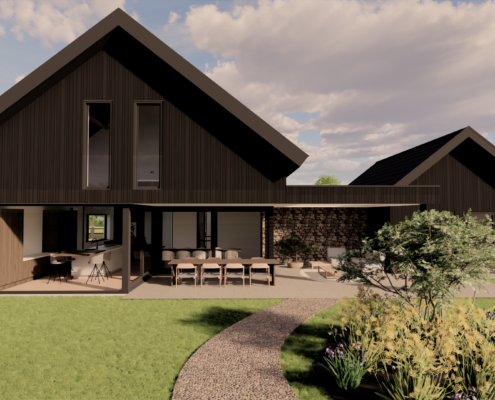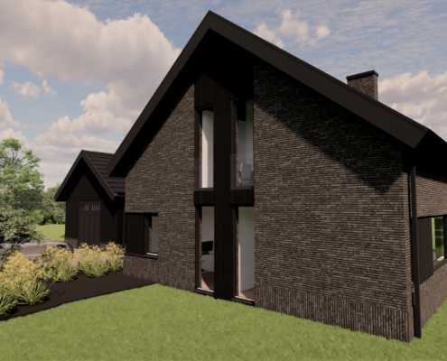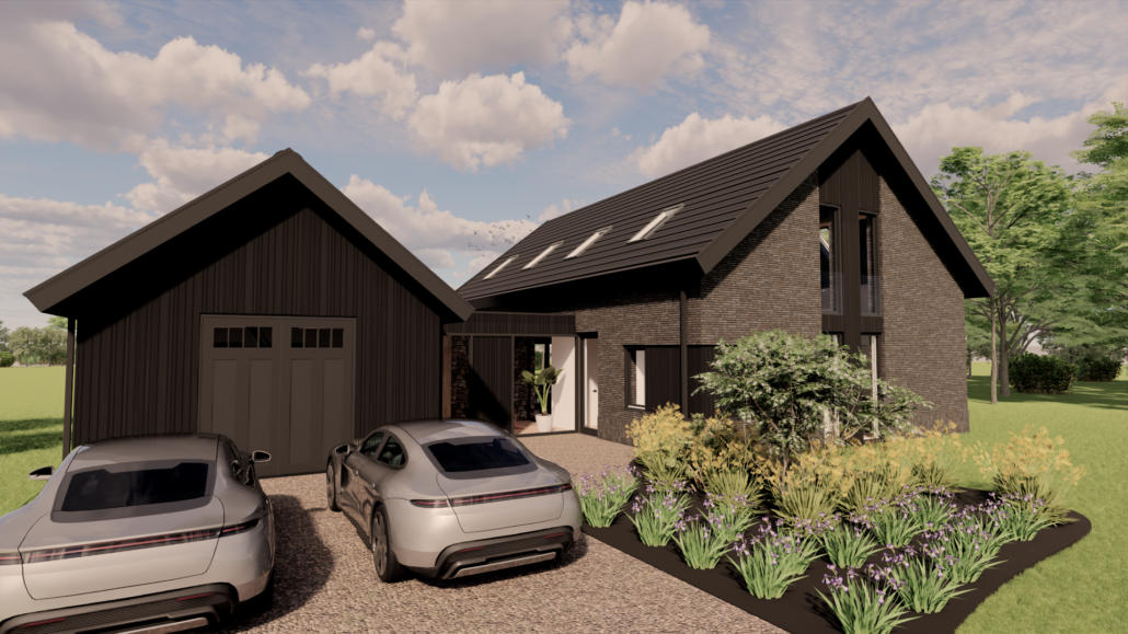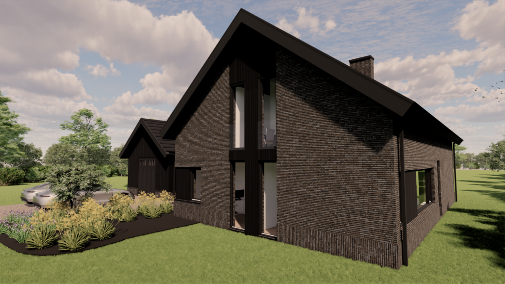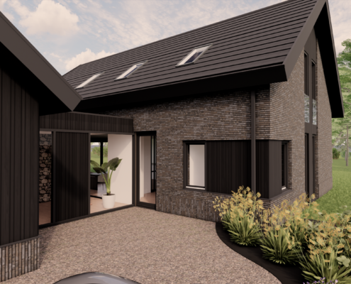 De combinatie van donkere gevelbekleding, warm metselwerk en subtiele details zorgt voor een krachtig maar uitnodigend geheel. Door de balans tussen moderne architectuur en een landelijke vormgeving ontstaat een woning die zowel eigentijds als sfeervol aanvoelt en perfect opgaat in haar groene omgeving.